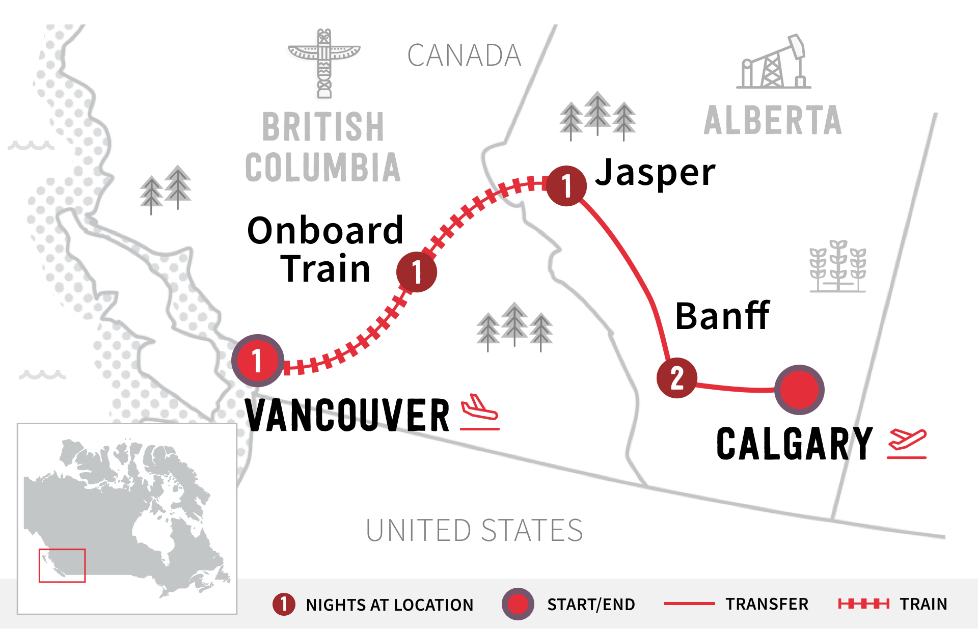 From the mountain towns of Jasper and Banff to the laid-back West Coast city of Vancouver and the adventure of an overnight rail trip through the Canadian Rockies – this trip packs it all into six days.