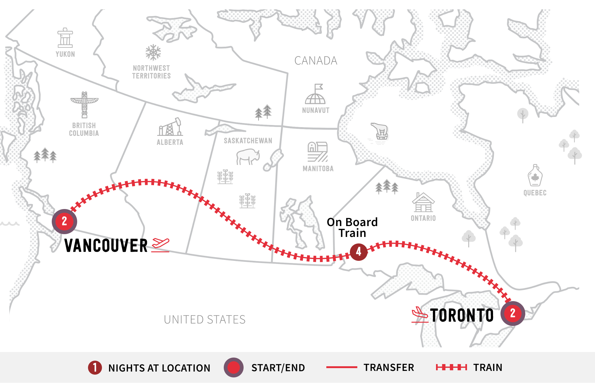 On this four-night rail journey, travel from Toronto through the Canadian Rockies to coastal Vancouver. As you travel across the country, experience first-hand the diverse landscape of Canada.