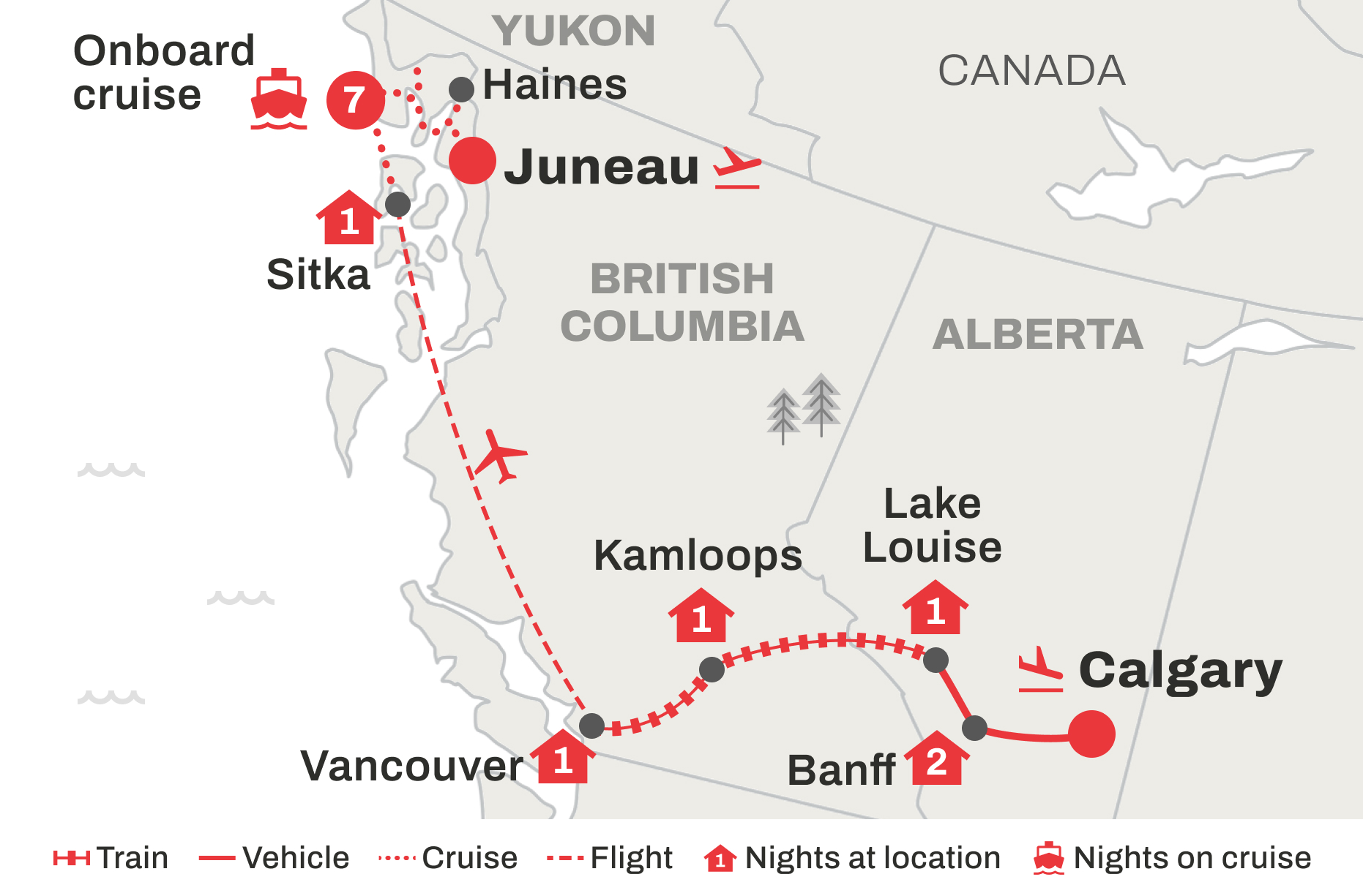 Marvel at the beauty of iconic Lake Louise, before a luxurious Rocky Mountaineer train journey to Vancouver. Travel to Sitka, Alaska where your small ship crew will sail you into the heart of Alaska’s wilderness. Here, a team of guides lead you into the remote bays and fjords of Alaska, with a daily menu of adventure only a small ship experience can offer.